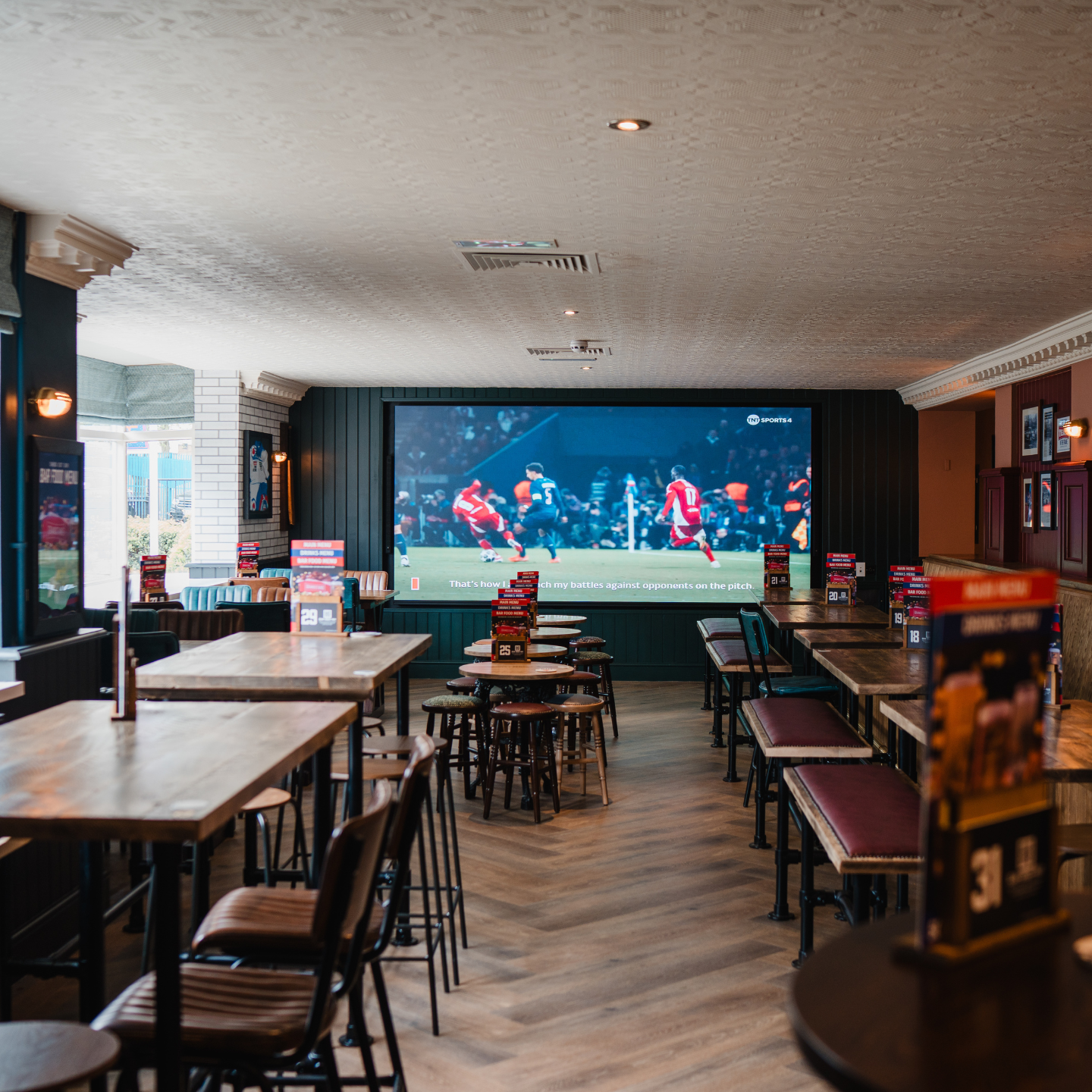 We’re all about proper pub classics and pints. Think Fish & Chips and Sunday Roasts washed down with pints of Carling or Peroni. And for those mid-game munchies we’ve got plenty of pick-up bar food, pasty anyone?